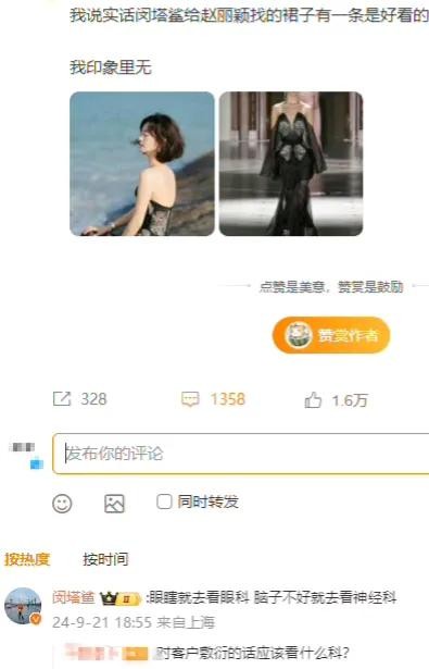而针对网友对于此次赵丽颖红毯造型的吐槽,闵塔鲨霸气回应道:眼瞎就去看眼科,脑子不好就去看神经科!