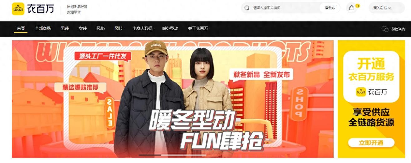 衣百万:衣百万是一家专业的服装批发(B2B)代发货平台。目前,市场上整合了厂家女装货源,包括杭州四季青服装、石狮服装、广州女装、新塘牛仔、晋江鞋、温州鞋等。批发市场用品及服装厂家为全国电商卖家、直播机构、小微企业等各平台提供高性价比的服装用品及一件代发服务。衣百万优点是专业、实用、互动,但只开放经销商注册,个人买家无法购买。
