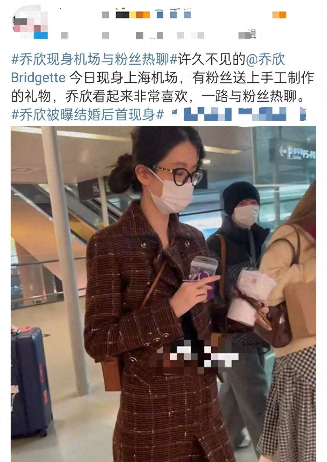 12月3日,乔欣被曝结婚后在上海机场首次公开亮相,身穿香奈儿豪华套装,手上未戴婚戒。有粉丝送上手工制作的礼物,乔欣看起来非常喜欢,一路与粉丝热聊。