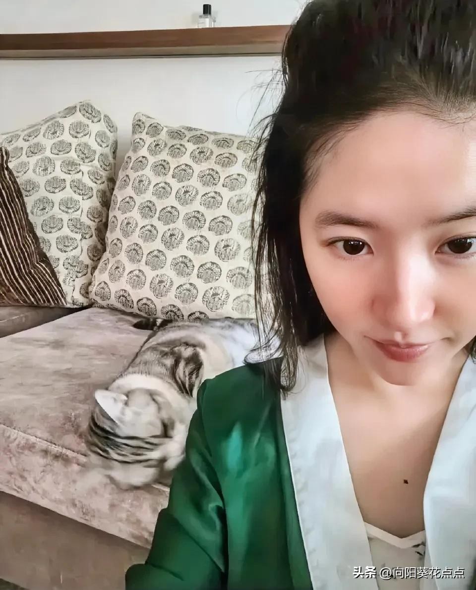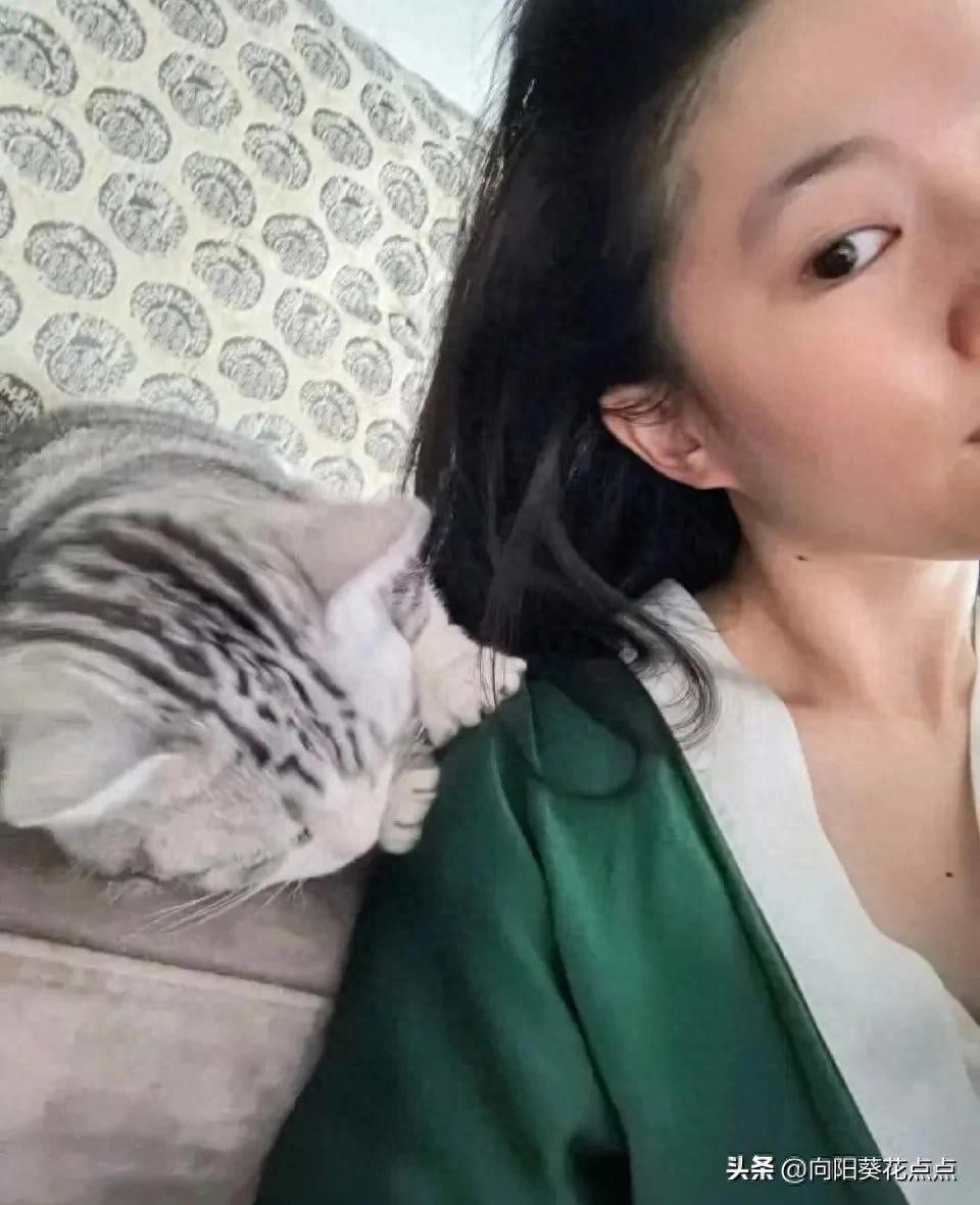 只见在她发布的自媒体平台上一身绿色睡衣的她是一点妆都不化呀,素颜的她看起来应该是起床后还没出门的样子,一副舒适自在的感觉。而作为她旁边的小猫也是相当的慵懒,看的出和此时的他也是相当的搭呢。