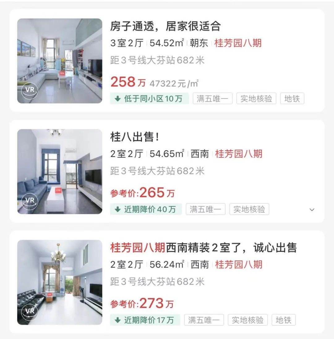 龙岗区近几年流动性最好、成交量最大的小区桂芳园,岳老师截图了桂芳园八期挂牌低于指导价的房源,主力55㎡户型来对比一下2019年四季度的价格。深圳当下最应该买的房子