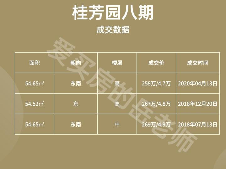 55㎡成交价在250-270万上下,单价在4.7-4.9万/㎡上下。现在桂芳园八期的报价基本上已经到了2018年的价格了......