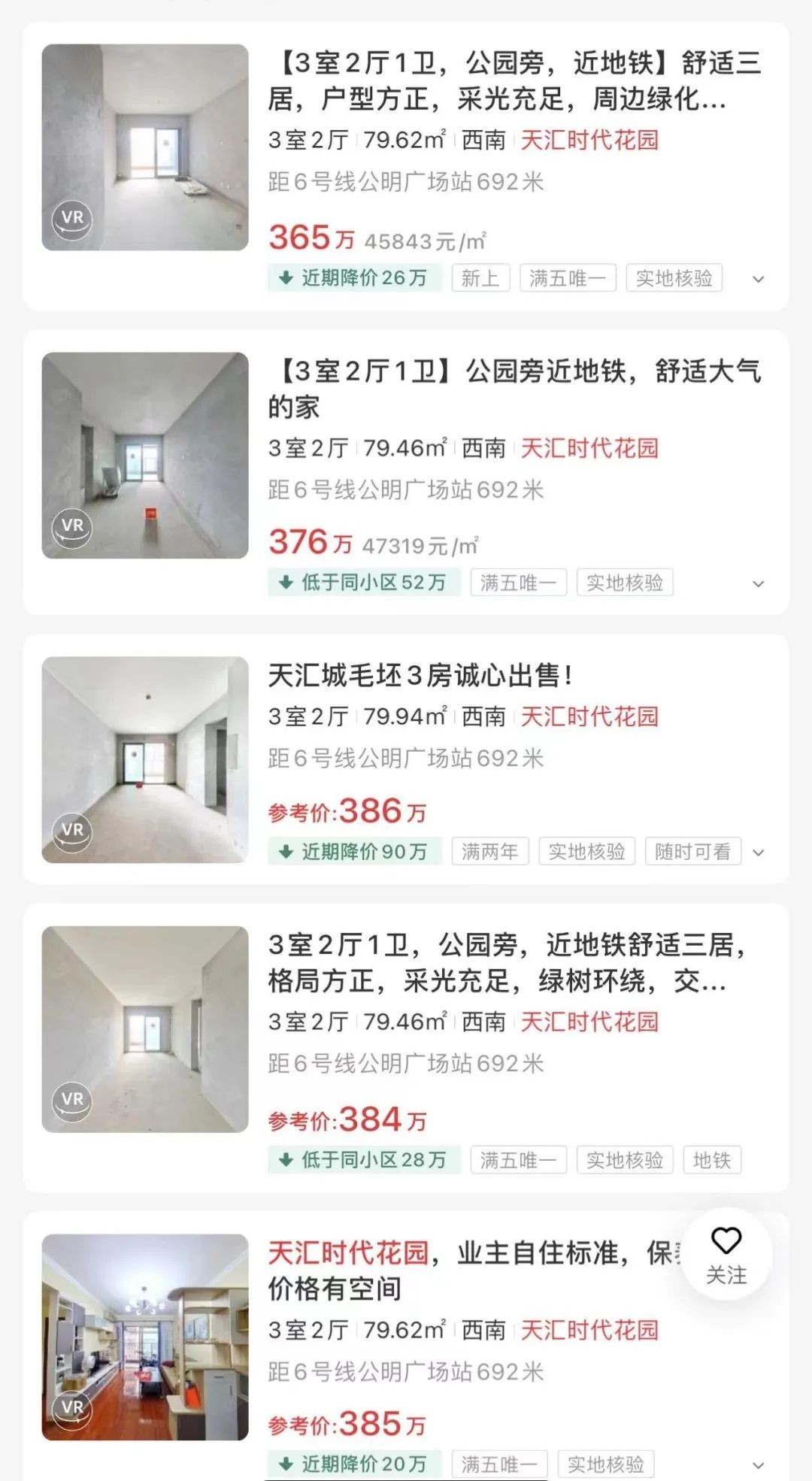 最后拿一个,光明区区近几年流动性最好、成交量最大的小区天汇时代花园,岳老师截图了天汇时代花园一期挂牌低于指导价的房源,主力79㎡户型来对比一下2019年四季度的价格。深圳当下最应该买的房子