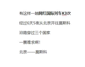 其实除了这一趟最网红的国际列车,中国还有北京-朝鲜、南宁-河内、乌鲁木齐-哈萨克斯坦这几列国际列车,只不过行程、出发地目的地都不及这一列金光闪闪的K3。