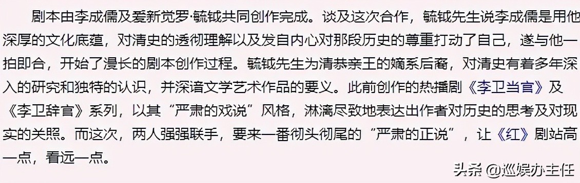 而他的《红墙绿瓦》虽然是一部不错的电视剧,倾注了李成儒和一位爱新觉罗·毓钺(毓钺是奕䜣的嫡系后裔)10多年的心血,但是电视台不愿意买,因为电视台非常知道观众喜欢看什么,李成儒对此也耿耿于怀。