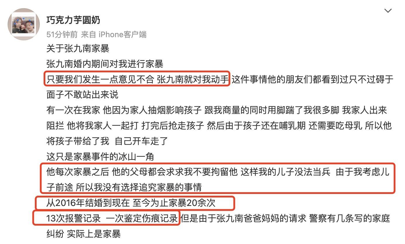 据悉从2016年结婚开始,迄今已经家暴了20余次,有13次报警记录,一次鉴定伤痕记录。只要发生一点意见不合,张九南便会动手。他每次家暴之后,他的父母都会要求不要拘留他,因为留案底就会影响下面孩子的前途,所以就没有追究家暴的事情