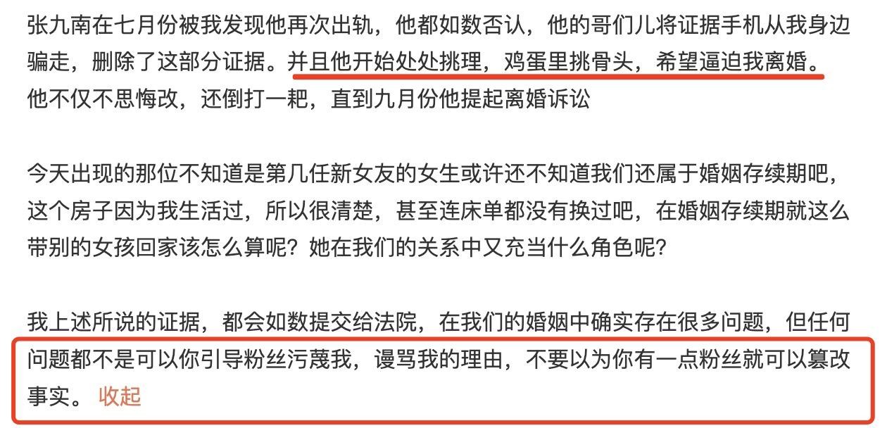 该自称是张九南妻子的网友表示,在去年九月份,张九南哄骗她同意离婚诉讼,并表示会在三年后复婚。张九南曾出轨多次,在孩子只有一岁大的时候,被发现还写下了检讨书,在2016年至2020年期间,他出轨了十多次,有时还将女方约到家里来,后来被粉丝爆料上了热搜,后来妻子私下联系爆料的粉丝可以私了,但是换来的是张九南无尽的出轨。