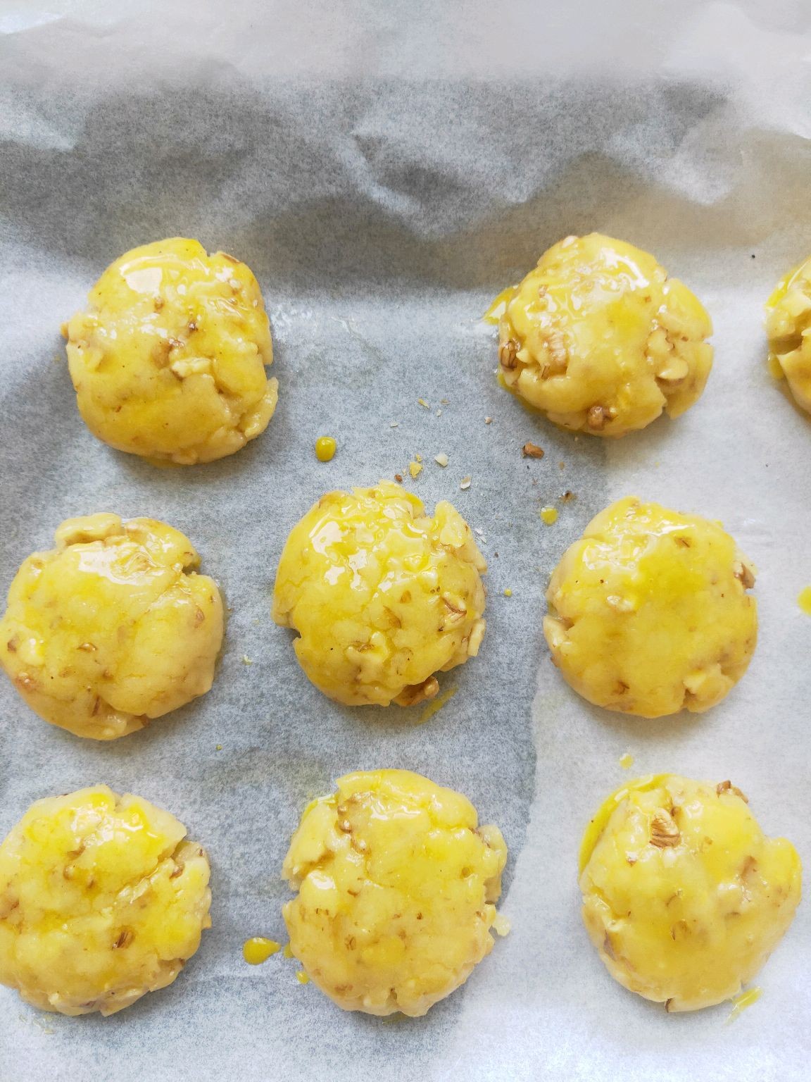 8.将面团取出均匀大小,把核桃仁撒上后涂上一层蛋液;