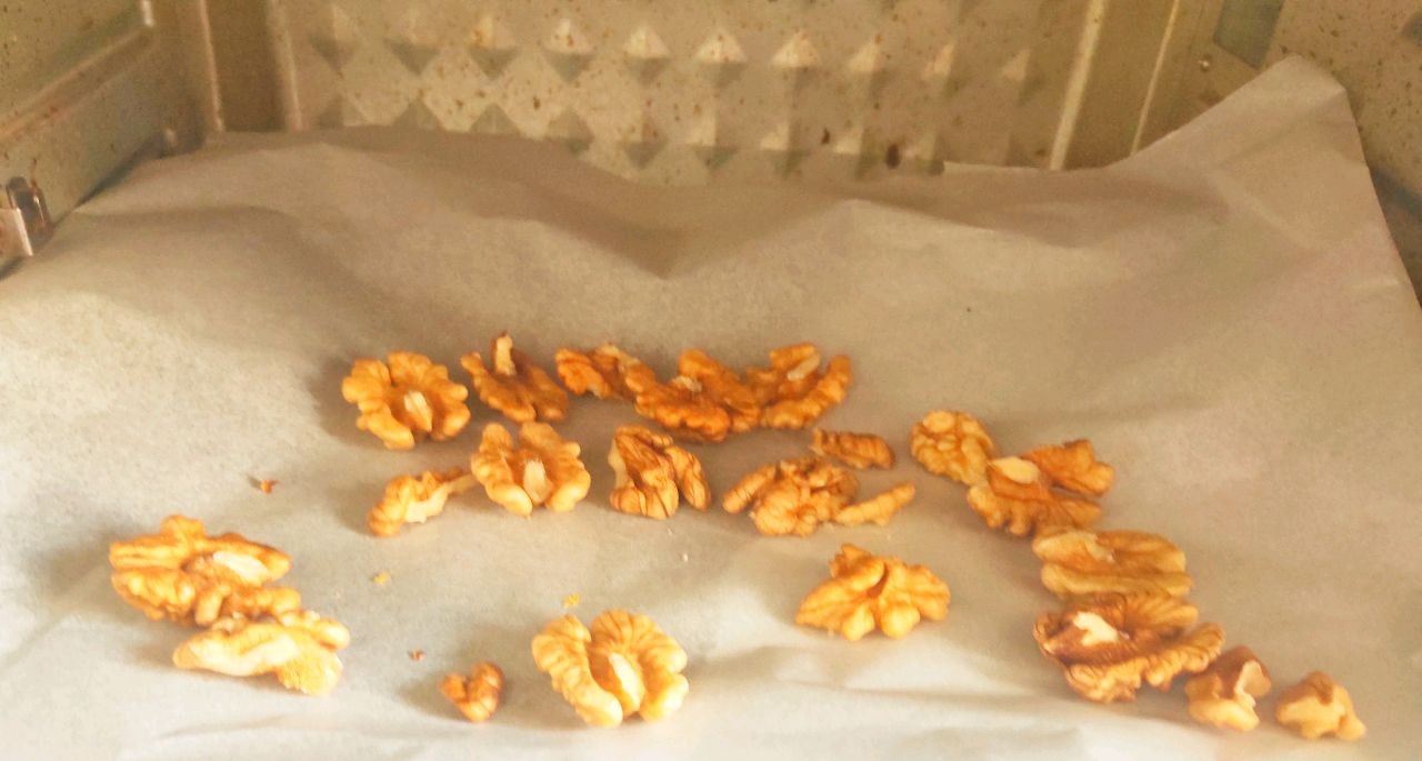 2.核桃仁放到烤箱里面加热;
