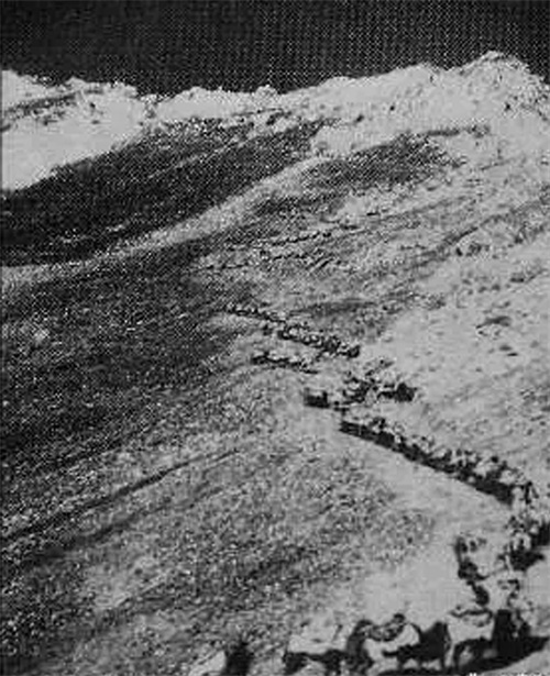 据生还者讲述,当时队伍里,好多战友出现了恶心、呕吐的现象,因为缺氧脑袋头疼欲裂,脖子上青筋暴起,皮肤被憋成了紫色。队伍走着走着,就会有同伴因为支撑不住昏倒。这些士兵并没有因为困难退缩,有人晕倒了,醒着的人会主动背起同伴,经过将近一个月的长途跋涉,先遣队员终于达到了军队指定的地方等待后续部队到来。