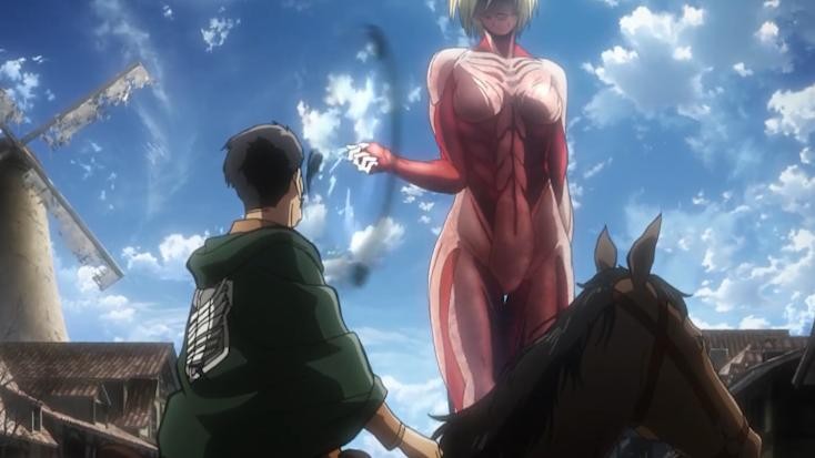女巨人为了抢夺艾伦首次出现,她一直追赶着保护艾伦的利威尔班,并一路尾随,变身加长途奔袭,进行了多场的战斗。