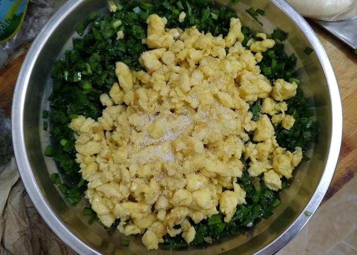 再将凉下来的鸡蛋碎倒入韭菜中,撒上少许食盐,搅拌均匀,这样馅料就拌好了。