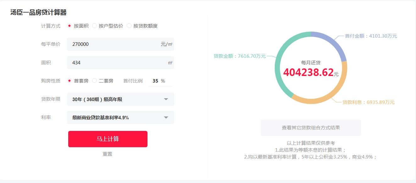从网上查询的汤臣一品房价为270000元/平米,项目推出的都是约434.0~767.0㎡的房源,767㎡复式,434㎡大平层。咱们算下买个最小的434平的,总价是117180000元,一亿一千多万。如果是按照咱普通人这种按揭买房,首付款是三千多万,每个月的房贷是43.5万元,每月的房贷就相当于很多人的首付了吧。