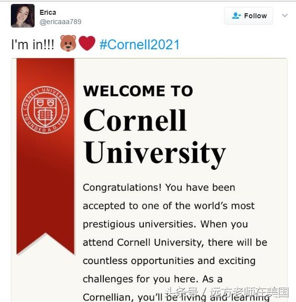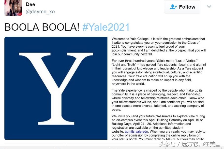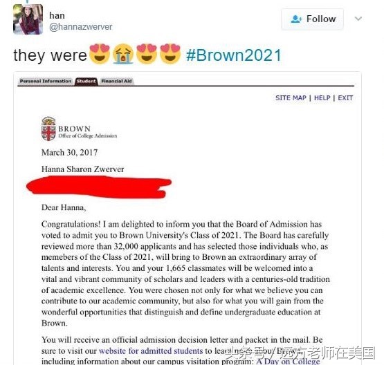 所以在这个下午,对于那些常春藤大学的申请人来说,在忐忑不安地打开自己的邮箱时,如果看到了“梦想大学”发来的录取通知书,他们无疑是人们眼中的幸运儿。许多激动的幸运儿迫不及待地在自己的社交媒体上晒出录取通知书,与亲朋好友甚至是陌生人分享自己的快乐。下面是Business Insider在常春藤发榜一个小时后登出的被录取者们晒出的大学录取通知书,