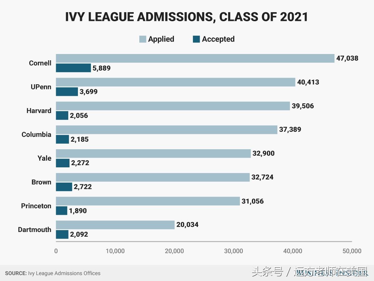 最后上一张图,显示的是每所常春藤大学今年申请者和录取人数(浅色的代表申请人数,深色代表录取人数)。在如此激烈的竞争中胜出,难怪被录取的学生无法抑制兴奋的心情。