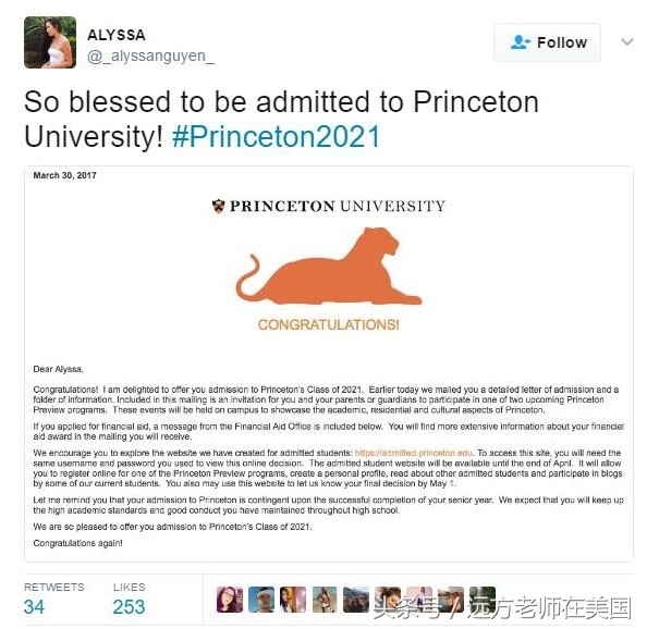 上面是普林斯顿大学的录取通知书,被录取者是一位亚裔女生。