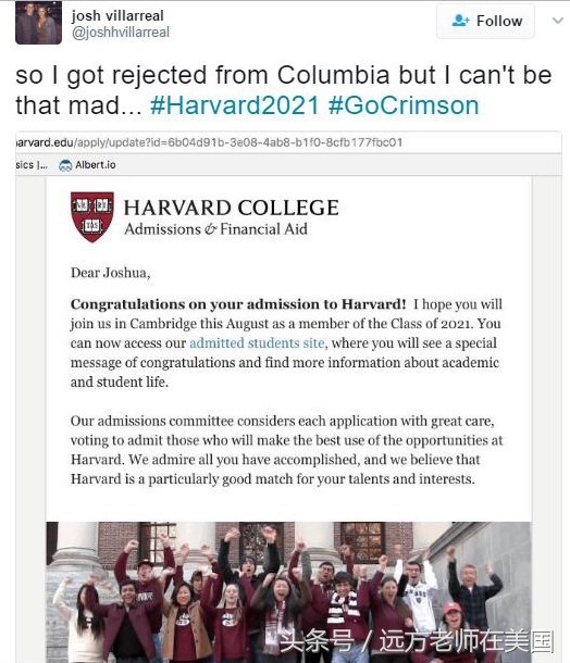 上面是哈佛大学的录取通知书,Joshua刚刚收到哥伦比亚大学的拒绝信,紧接着就看到了哈佛的通知书,这心情一定跟坐过山车似的。