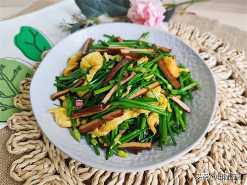 食材:韭苔、五香豆腐干、鸡蛋、盐、糖、白胡椒
