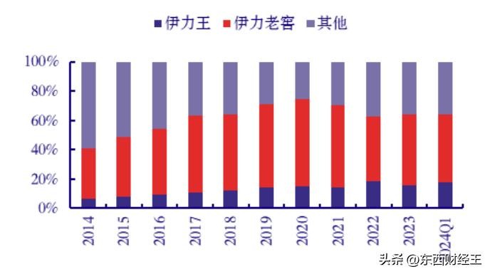 伊力特的营业收入与净利润近些年来始终维持着稳健增长的态势,在 2023 年,营业收入同比上扬 37.5%,净利润同比攀升 105.53%,整体的盈利增长速度于行业之中堪称遥遥领先。其中,伊力老窖乃是公司收入的核心来源,在营收中所占的比例约为 40%;紧随其后的则是伊力王。