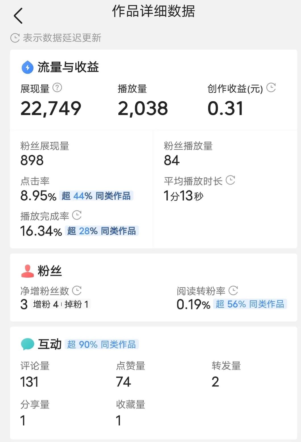 这个视频的收益我感觉有点忒少了,2000多的播放量才3毛钱
