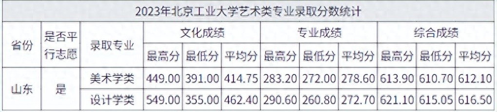 2023年北京工业大学针对山东平行志愿美术学录取综合分对低分为610.70,小陈美术综合分为321.5,文化综合分最少需要289.2分。