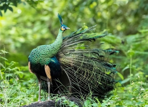 绿孔雀相较于常见的蓝孔雀,其外貌更为华丽。它的颈部羽毛如同“绿宝石”,看起来极似传说中的“龙鳞”。特别是雄鸟,它们的尾羽相当显眼,长达一米多。同样令人瞩目的还有雌鸟的羽毛,它们的色彩绚丽而不同凡响,但相对的,与雄鸟的大尾巴相比起来有所不同。相较于普通孔雀,其具有自己独特的特点。在绿色和各种斑斓色彩的衬托下,绿孔雀显得尤为华丽且引人注目。
