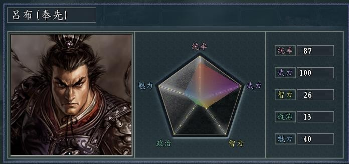 在光荣出品的策略沙盘类游戏《三国志11》中,吕布是唯一出场时武力就达到100的武将,并且是特技“飞将”的专属拥有者,比武圣关羽的特技“神将”还要厉害一点。