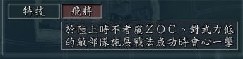 “飞将”的效果是: 在陆地上行动时不考虑 ZOC(Zones of Control,即其率领的部队可以无视地形和敌方部队的阻碍),并且对武力低于自己的敌部队施展战法成功时会触发会心一击(暴击)。