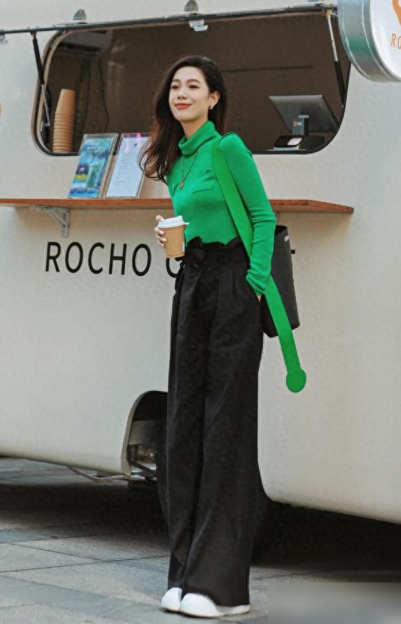暖绿色有显白的效果,同时也能体现出穿着者良好的时尚态度,但是这样的搭配不能选错款型设计,否则就起不到这些效果了。