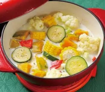 3.煮约5分钟后加入椰浆及盐,小火煮约5分钟至蔬菜软,即可食用。