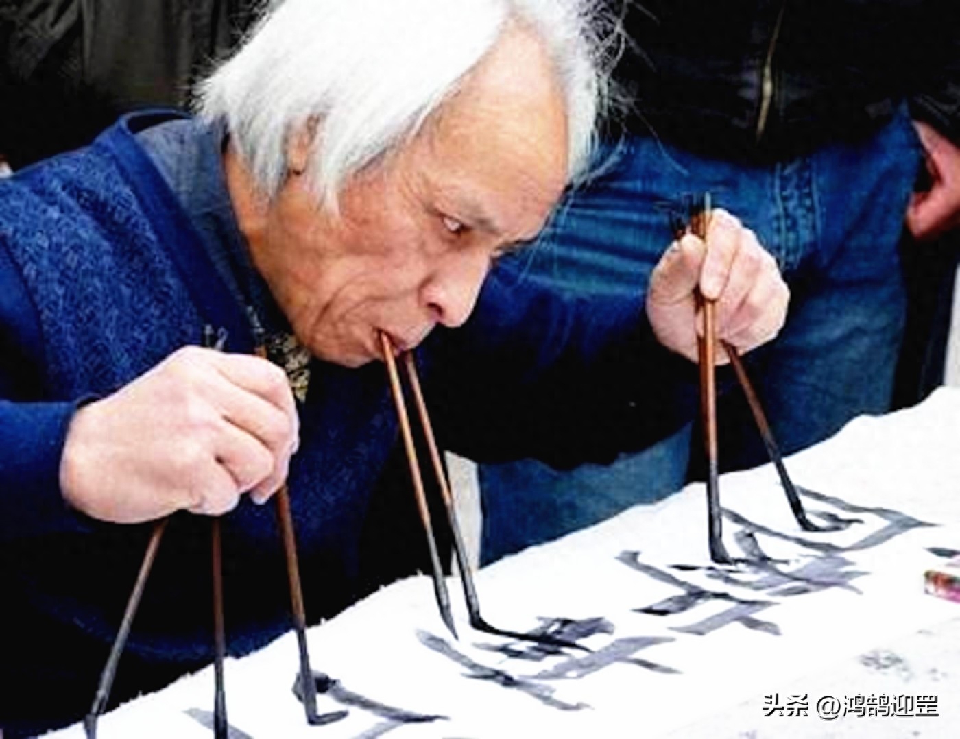实际上,不少“江湖书法”已经不屑于手握毛笔书写,而是用嘴巴、鼻孔、脚趾等身体部位夹着毛笔写字。一些人甚至连毛笔都懒得用,用头发、拖把、针管等道具来“画字”,书法硬生生被搞成了行为艺术。