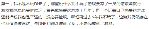 不过在长文中,旭旭宝宝也说了DNF即便缺少自己也照样能正常运作,一个游戏当然不会因为少了谁就没法继续运作,毕竟这也是个十三年的老游戏了,不是旭旭宝宝成就了DNF,而是DNF成就了他,自己也不过是利用了直播兴起的这么一个好时代才顺势崛起的,DNF当之无愧为国产端游常青树。