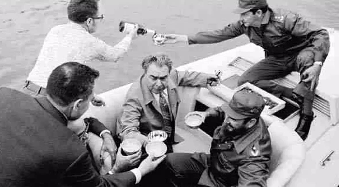 1974年勃列日涅夫访问古巴时,与古巴领导人卡斯特罗用碗畅饮。