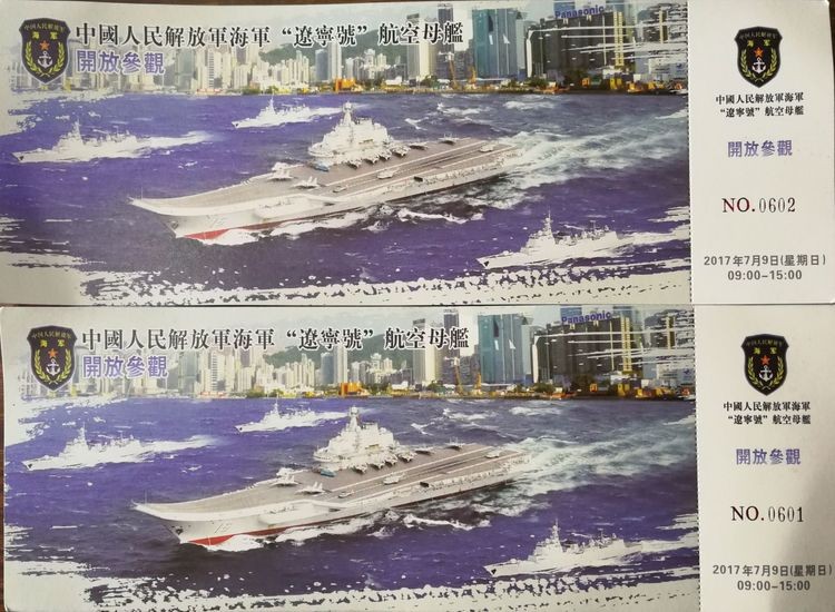 参观航空母舰的门票。2017年7月3日经过十多小时的风吹雨打日头晒,我们如愿以偿领到了9号的参观卷。