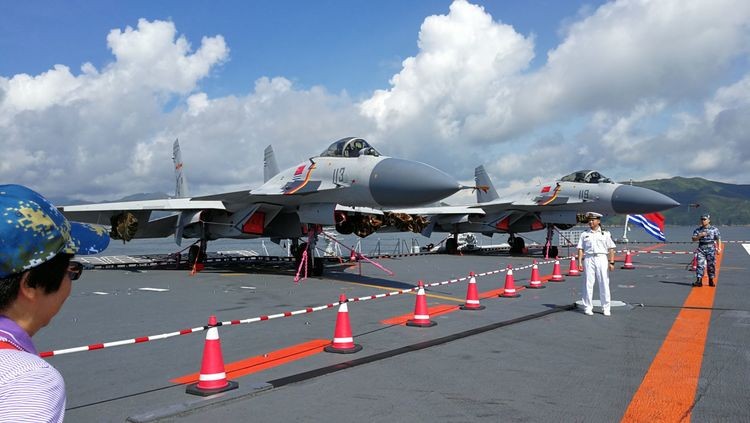 上到飞机甲板最先进入眼帘的是这两架歼15飞鲨舰载机