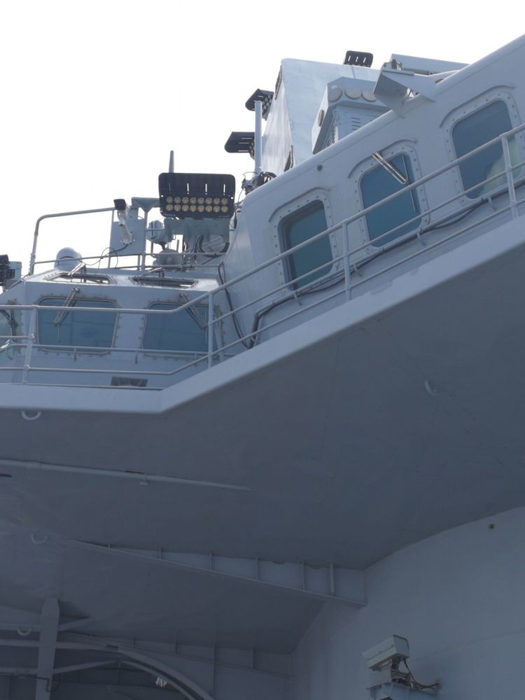 大约有五六层楼高的舰岛,是航空母舰的指挥大脑,我国科学技术的结晶,壮观。