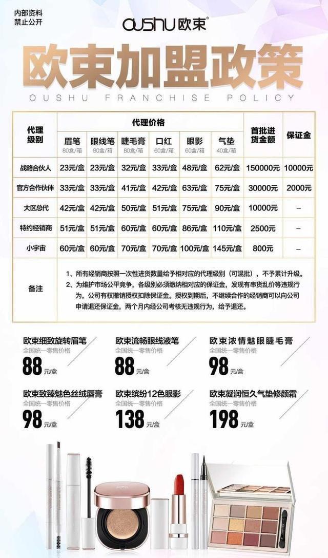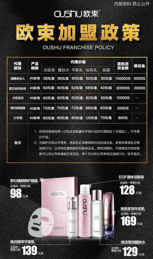 欧束产品并不多,分五个代理等级。等级越高拿货越便宜,高价卖给人家谁会买啊,都能买大牌了,东西都是卖给代理了。代理再继续收代理。要不囤的货都卖不出去,差价超级大。气垫一级代理拿货三四十卖到最后198。真的赚翻了好嘛。