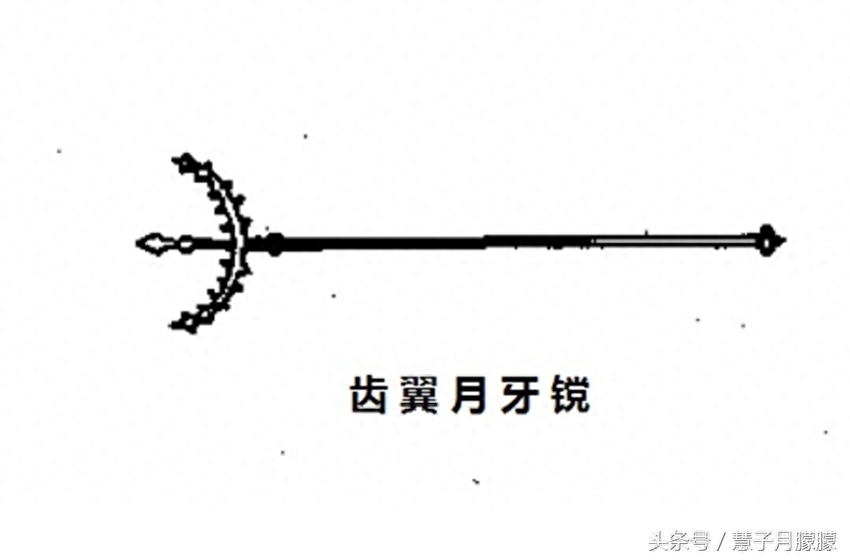 第八种:齿翼月牙镋。铁制,类似于凤翅镋。镋头有一尖2主刺16小刺,尖长1尺,主刺长8寸,小刺长5分,用法有刺、拦、扎、锯、架、盖、挑等。这种镋为戚继光杀倭所用,与狼筅配合,威力极大。