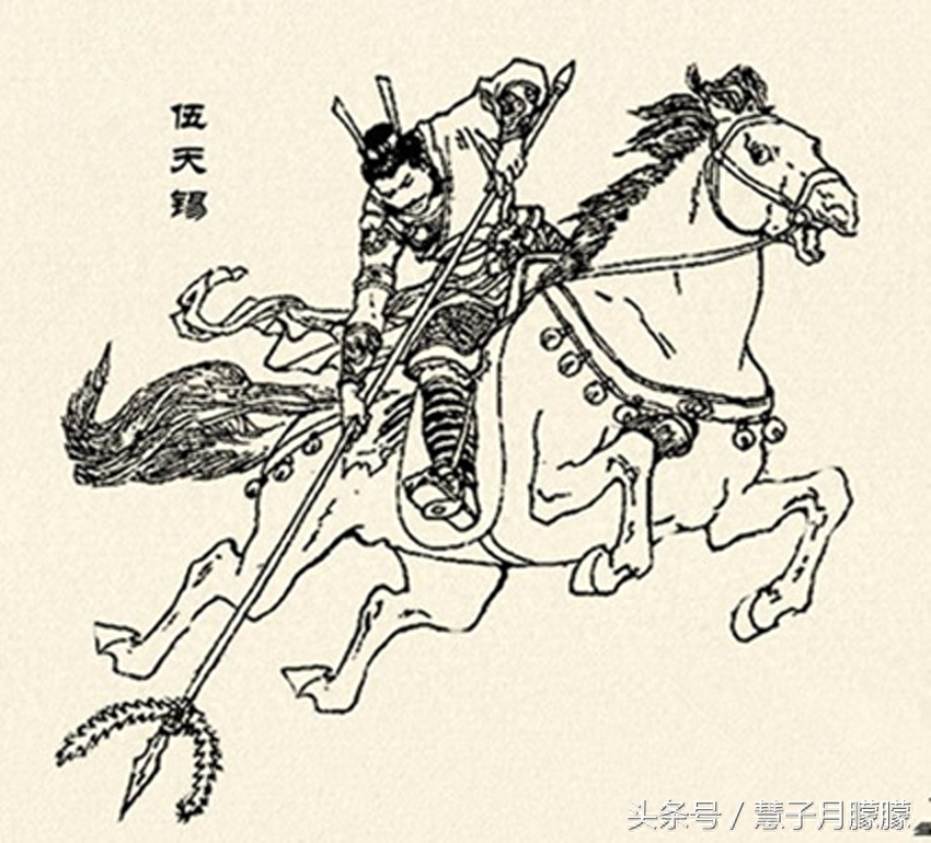 第三种:牛头月镋。又称“牛头镋”。其镋头形似三股叉。铁制,当中有利刃,状如剑尖。刀下横有两翅,弯曲如牛角,相距约一尺两寸。翅为棱形,四面削直,以求锋利。镋柄为粗木制成,长约六尺。牛头月镋能攻能守,尤善破枪。主要用法有支、捕、折、翻、捞等。《隋唐演义》中的猛将伍天锡用的就是这种镋,名为“半月混金镋”,重200斤,位列隋唐兵器谱第5位。