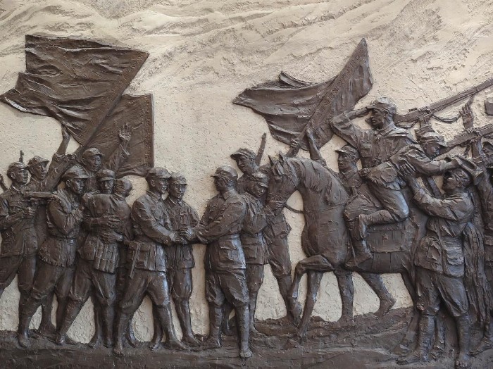 会议旧址,老槐树下的故事。1935年遵义会议召开的场景在此复原。每一处红檐灰墙的房屋里都以不同的形式记载着会议故事,有的是铜刻雕像还原历史面貌,有的是文字叙述阐述历史事件,有的是黑白照片记录革命岁月,有的是泛黄报纸撰写会议内容。处处透露着历史厚重感的会议旧址却以其最真实的模样向我们铺叙这段红色历史。“简单的物品却也透露着革命使命”队员严睿希感慨道。