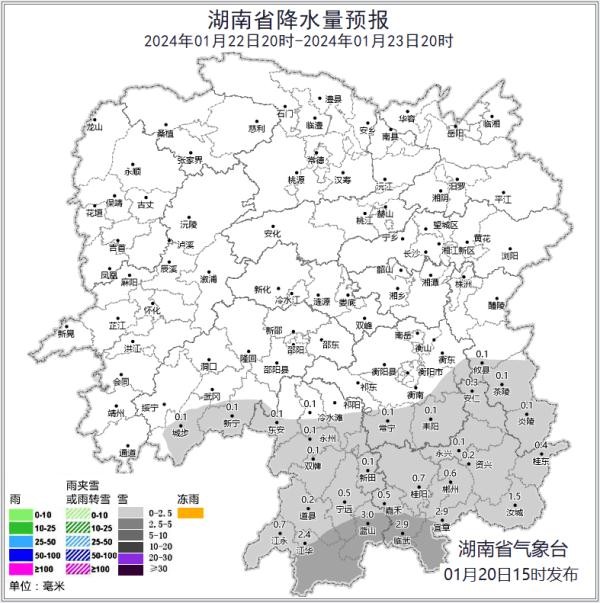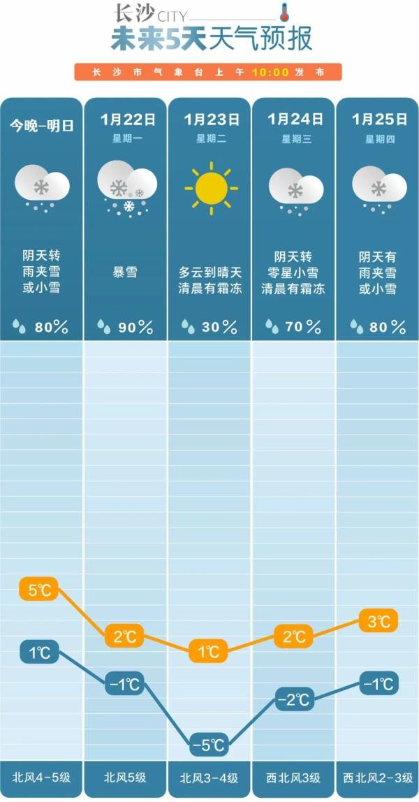 22日晚上到23日白天,湘南小到中雪转多云,其他地区多云间晴天;北风3~4级;最高气温湘南-1~1℃,其他地区1~3℃;最低气温湘中、湘北-6~-4℃,其他地区-3~-1℃。