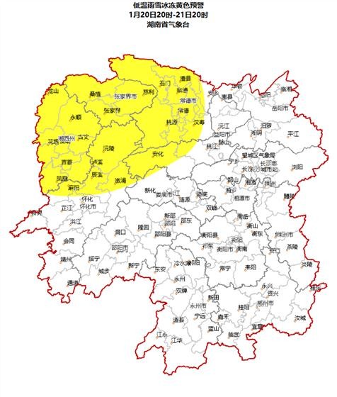 预计20日20时至21日20时,常德、张家界、益阳西南部、怀化北部、湘西州将出现雨凇或积雪,且最低气温≤1℃,请注意防范。
