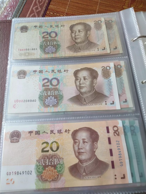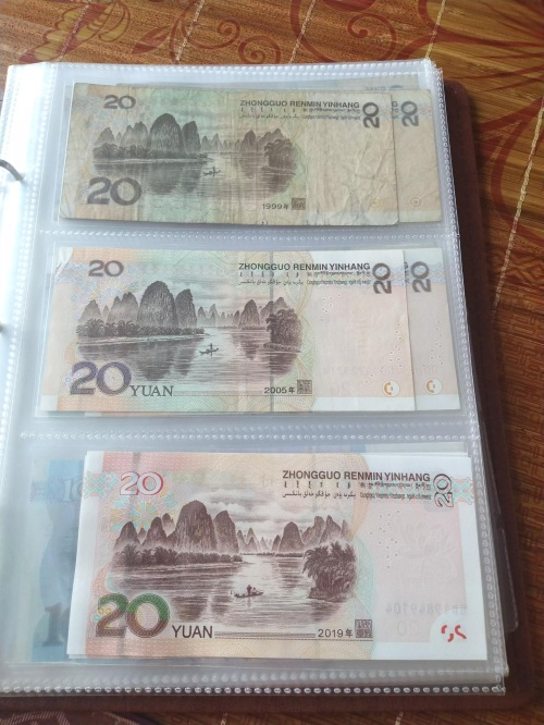 20元三个版本区分:正面99版错版无水印、05版凹印手感线、19版安全线;背面99版无yuan