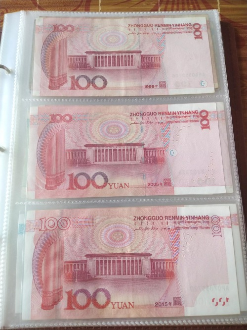 100元三个版本区分:正面99版竖号码、05版凹印手感线、15版安全线,背面看年号