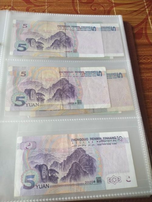 5元三个版本区分:正面99版无竖立号、05版凹印手感线、20版水仙花;99版背面同样没有yuan,不是错版币,收藏界定义为错版币