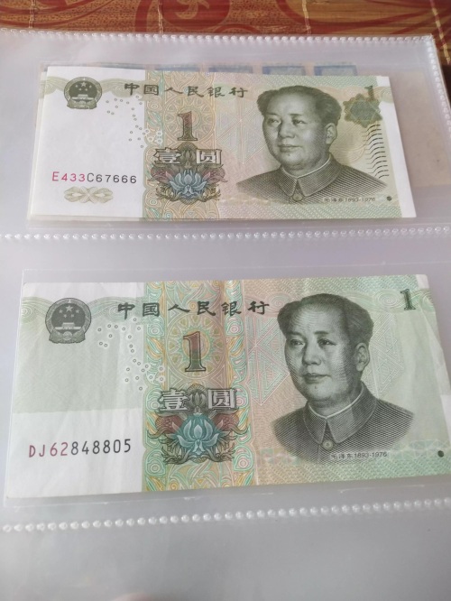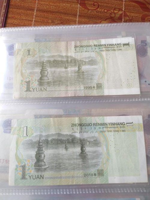 1元两个版本区分:99版凹印手感线、19版花奔水印、纸币颜色.