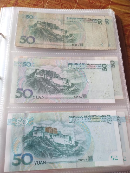 50元三个版本区分:正面99版竖号码、05版凹印手感线、19版安全线;19版背面布达拉宫上面衔金了(99版已经是第五套人民币币王了,目前价值不菲)