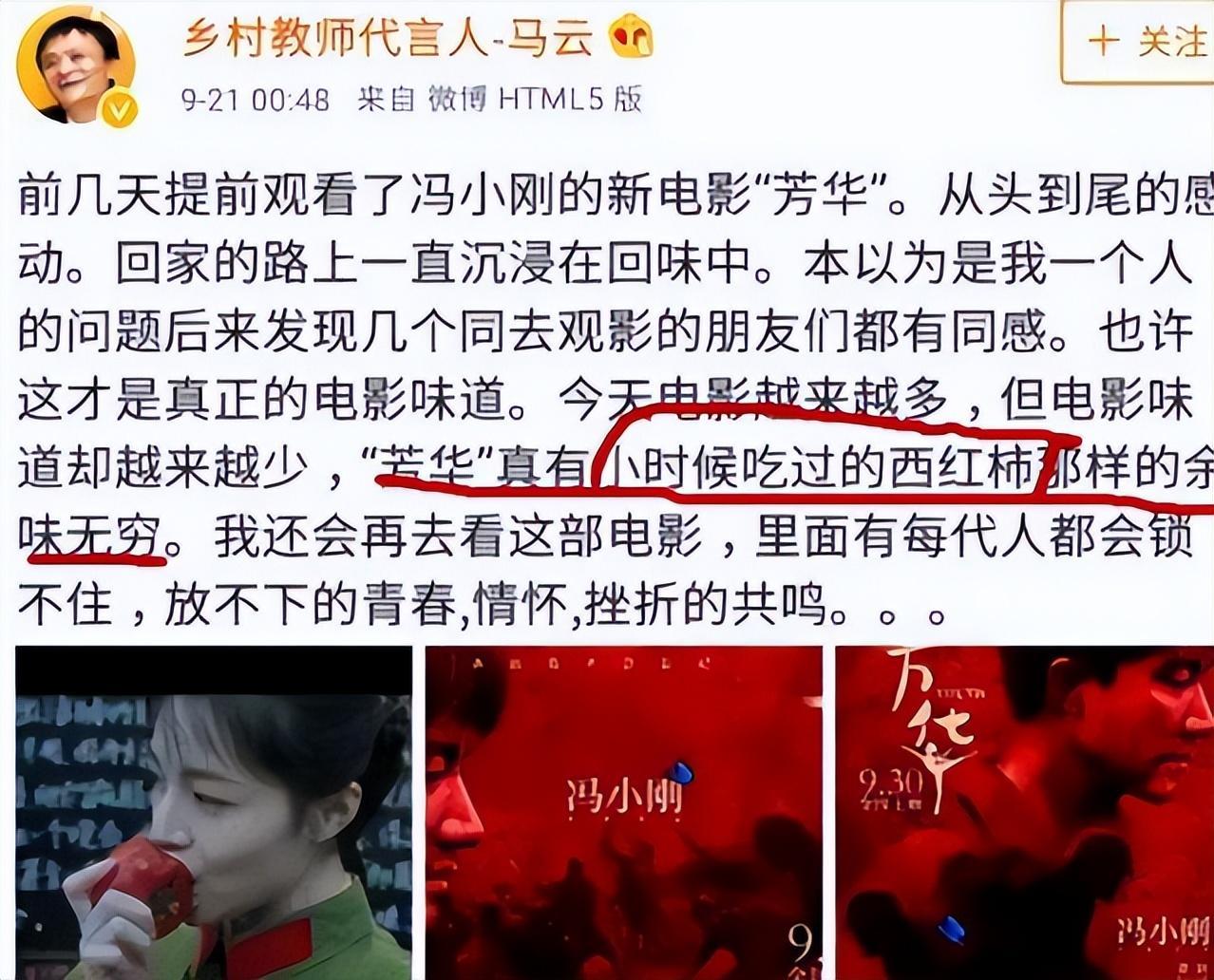 这下好了就剩钟楚曦一个人了不仅有华谊老总的这一曾关系还有马云看完电影后点名道姓的表扬马云夸她吃西红柿表演很精湛,配图也只配了钟楚曦一张影视照,不知道的还以为她才是主演。