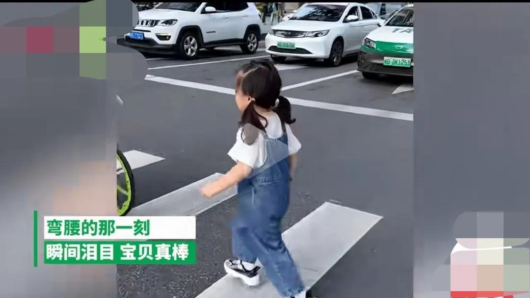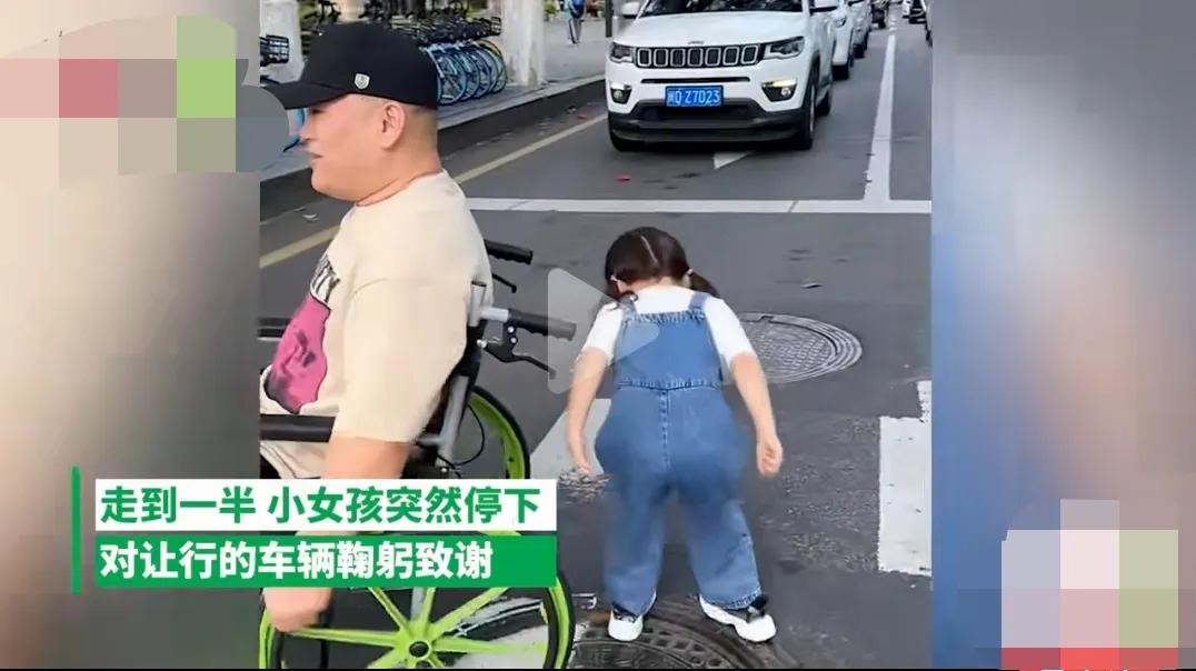 小女孩推爸爸过马路,向礼让司机鞠躬致谢:教育典范与正能量传递