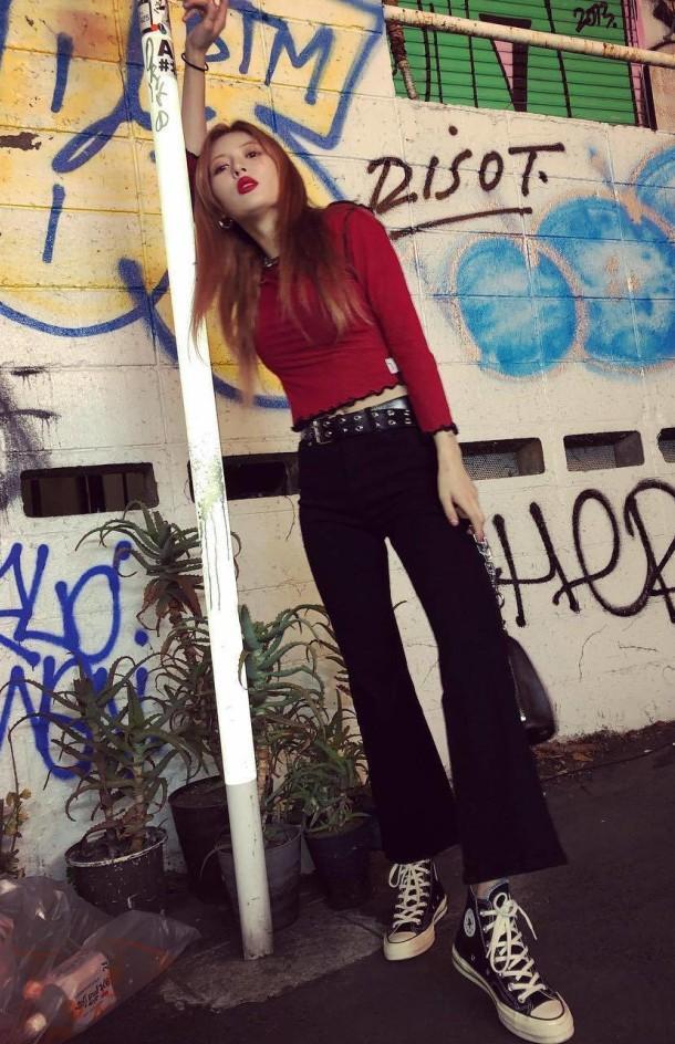 这就与她的穿搭有关系了,她的衣品很有个性,甚至有点“非主流”,不是一般人可以尝试的。相信看过她私服的观众们都知道,她比较偏爱穿袜子,特别是那种五颜六色的的中筒袜,要么搭配高帮帆布鞋,要么搭配靴子,都很有吸引力。